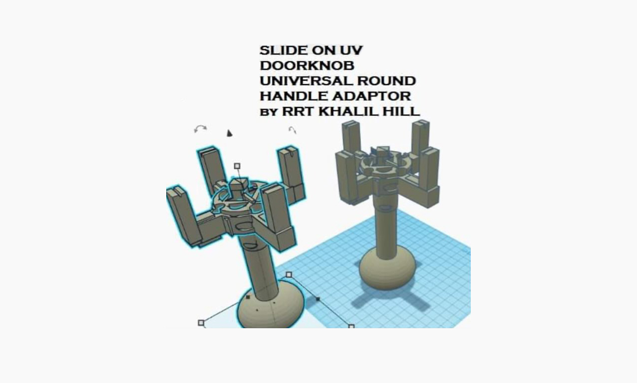 By mid April 2020 Covid19 had already ravaged the global sense of security as millions upon millions suffered the inconvenience of isolation, masks, shortages of gloves with no vaccine yet issued. My own Uv Railed Doorknob had undergone the public experiment of a modified rubber handball adaptor to see if that Matierial could attach a Uv light Petg handle to another handle via a rubber interface. Successfully as theorized on Facebook it had. With the media on the highest of health alerts I rapidly designed my first facsimile handball adaptor with a forked end to attach my UV slots transparent Handle and assembled the 3d print prototypes and professionally photographed then for the World Intellectual Property Organization.